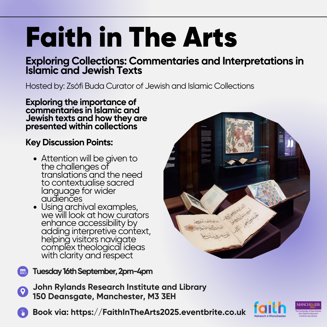 Join us on Tuesday 16th September, 2pm-4pm at the John Rylands Library for the final session in the Faith and the Arts Programme, delving into the central role of commentaries in Islamic and Jewish traditions. Discover how curators navigate the challenges of translation, context, and accessibility, making complex theological texts more understandable while staying true to their depth and meaning.