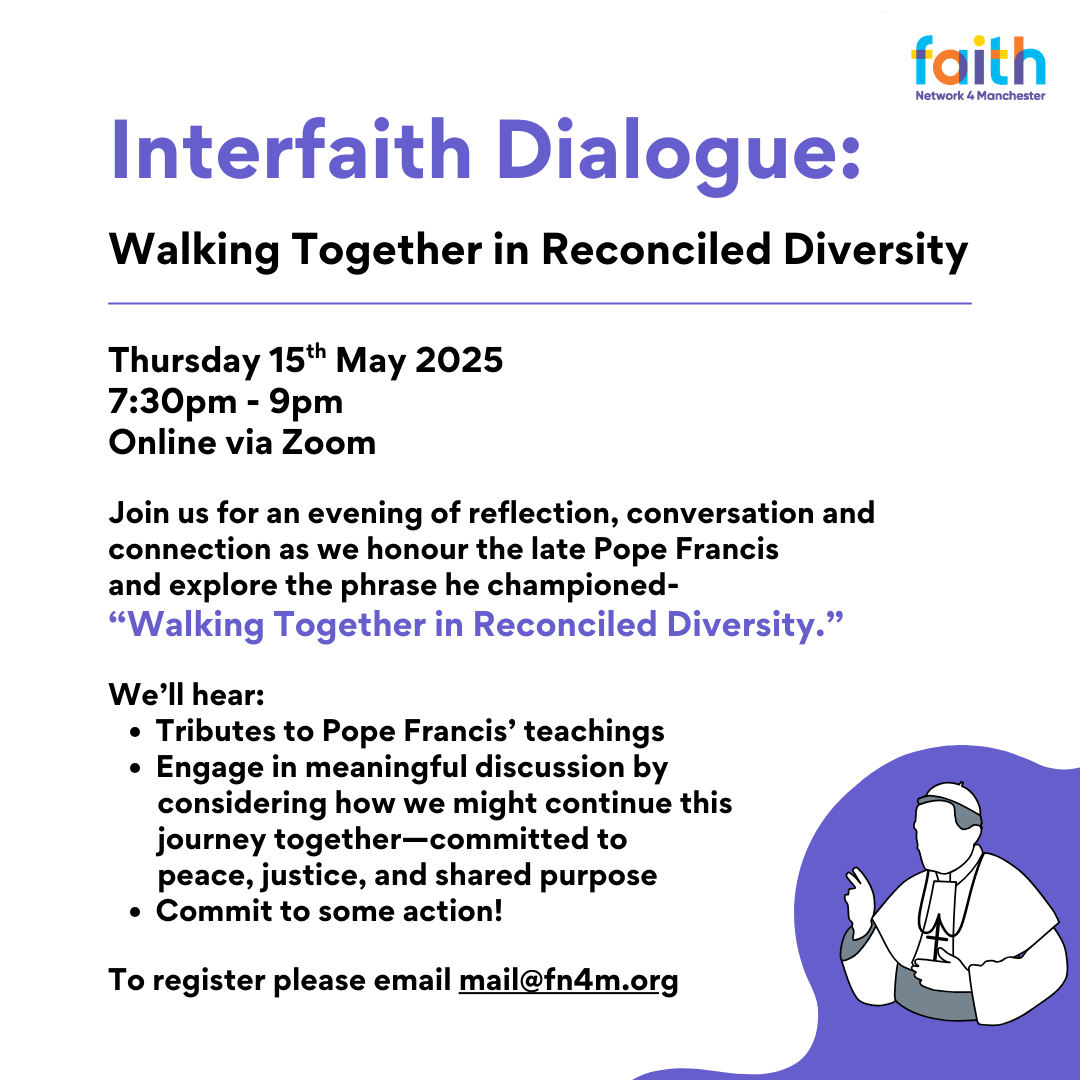 Join us on Thursday 15th May from 7:30pm-9pm for an evening of reflection, conversation, and connection as we honour the late and beloved Pope Francis and explore the phrase he championed: "Walking Together in Reconciled Diversity".
